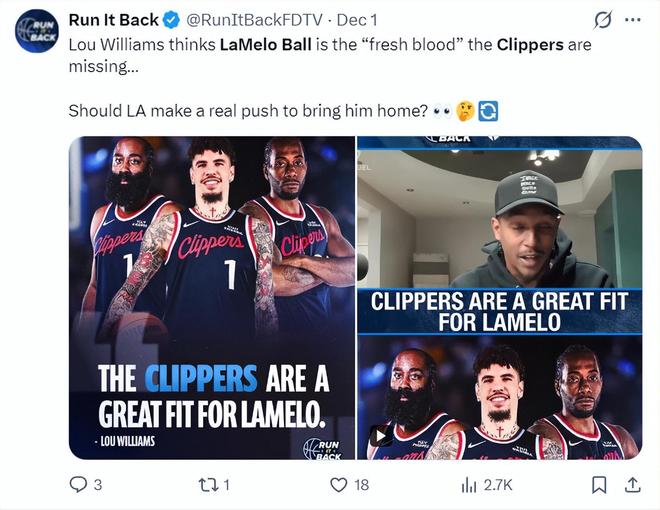 前快船球员路易斯-威廉姆斯也认为三球绝配快船,他可以在组织进攻端大幅减压哈登,哈登可以重返火箭登时期得分还能继续提升,有了两个持球点后小卡也能得到更多空位的机会。