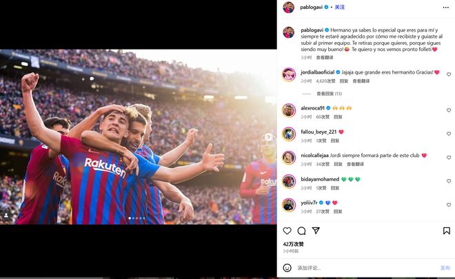 加维写道:兄弟,你知道你对我来说有多特别,我会永远感激你在我升入一线队时对我的接纳和指导。你选择退役是只是因为你想要休息,因为你依然很强!我爱你,我们很快再见,小精灵。